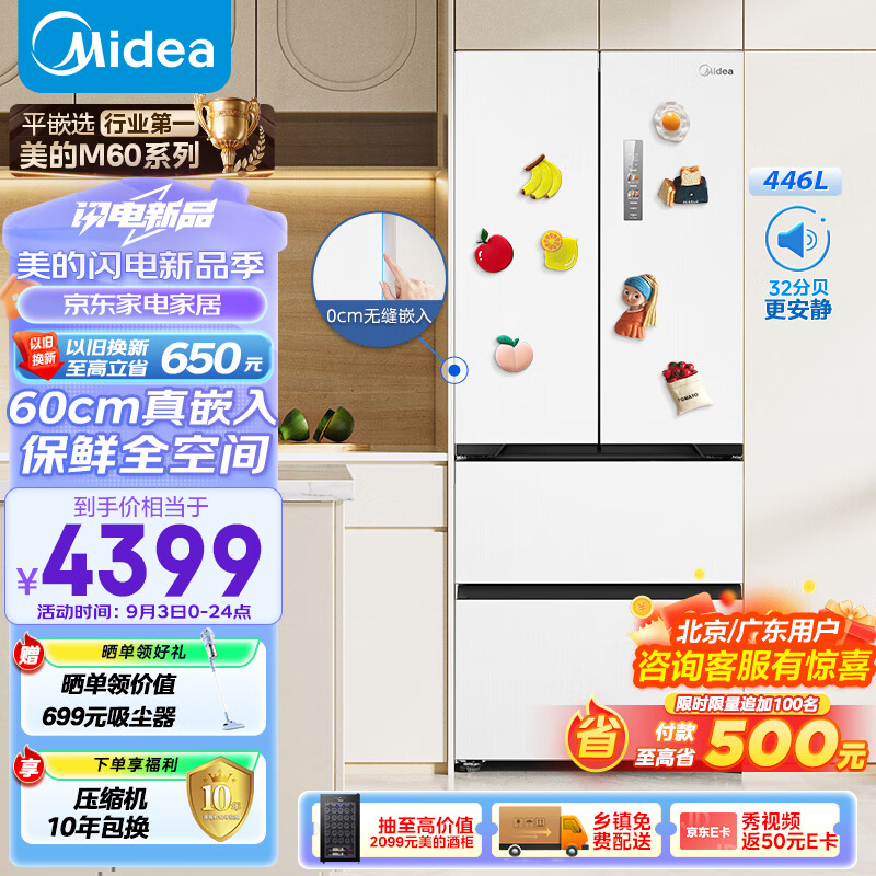 美的(Midea)M60大白豚468法式多门四开门超薄纯平全嵌底部散热变频无霜大容量家用电冰箱MR-468WUFPZE以旧换新价格:5299.00元!