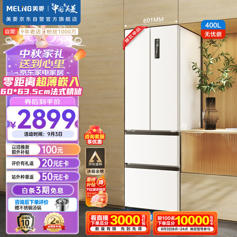 美菱(MeiLing)400升法式四开多门冰箱小户型家用底部散热超薄窄门嵌入式一级变频风冷无霜大容量白BCD-400WP9CZX价格:3099.00元!