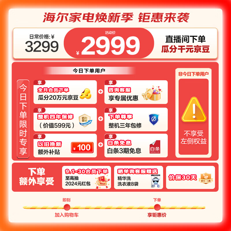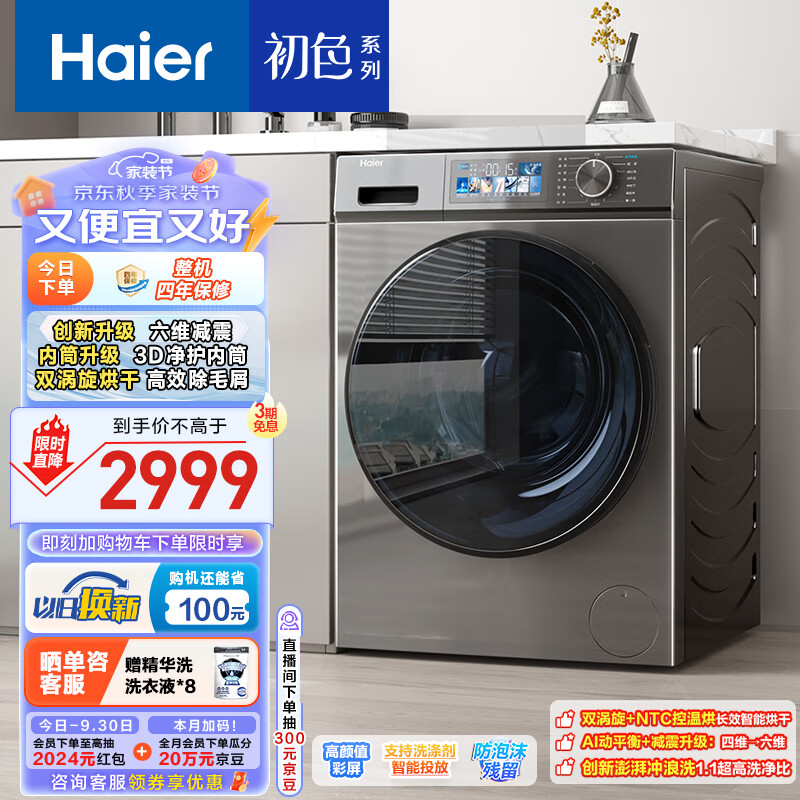 海尔(Haier)滚筒洗衣机全自动 初色系列K39Pro 洗烘一体机 EG100H65S 以旧换新 超薄带烘干 10公斤大容量价格:2999.00元!