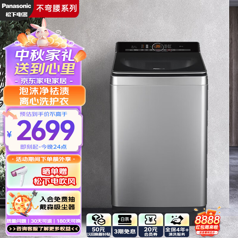 松下(Panasonic)波轮洗衣机全自动 9公斤大容量 变频电机轻音 泡沫净去渍 桶自洁免清洗 XQB90-UHBKM价格:2699.00元!