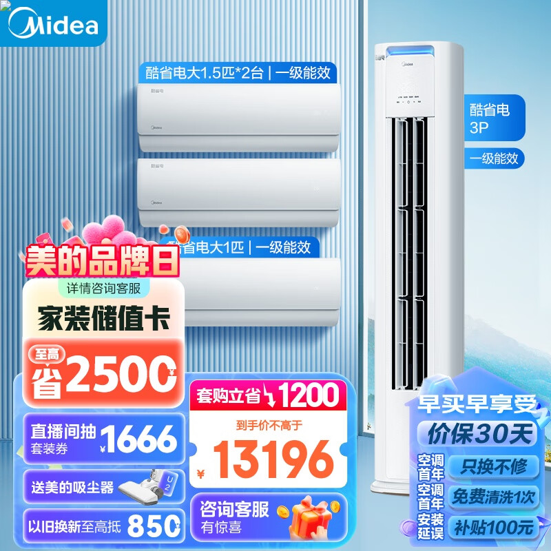 美的(Midea)空调 新一级能效 酷省电 空调套装 三室一厅 全家福套餐(大1匹+大1.5匹*2+3匹)价格:14396.00元!