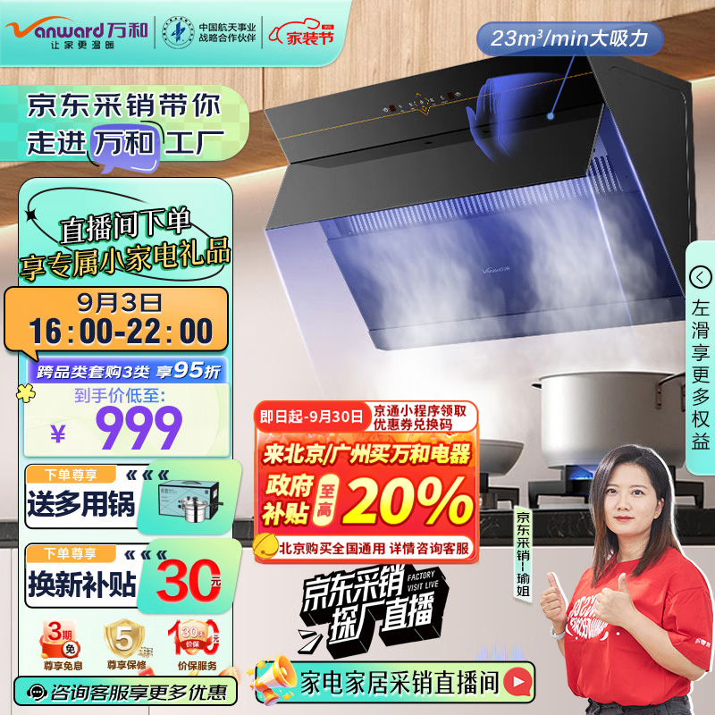 万和(Vanward)侧吸式抽油烟机家用厨房油烟机 23立方米大吸力 脱排油烟机排油烟机 自清洗挥手智控吸油烟机DJ738价格:999.00元!