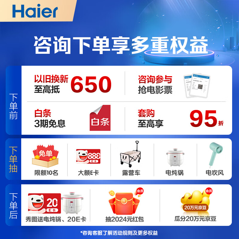 3、家里一直用的海尔的电器。这回还是选择海尔的。送货很快,安装也快。安装的师傅也很有耐心!给家里老人买的,咨询客服的时候回答的也很细致。还帮我对比了一下看中的另一个型号。对于选择困难症的我来说帮助很大。谢谢。