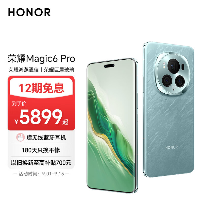 荣耀Magic6 Pro 荣耀鸿燕通信 荣耀巨犀玻璃 第三代骁龙8 16+512 海湖青 拍照 长续航 5G AI智能手机价格:5899.00元!
