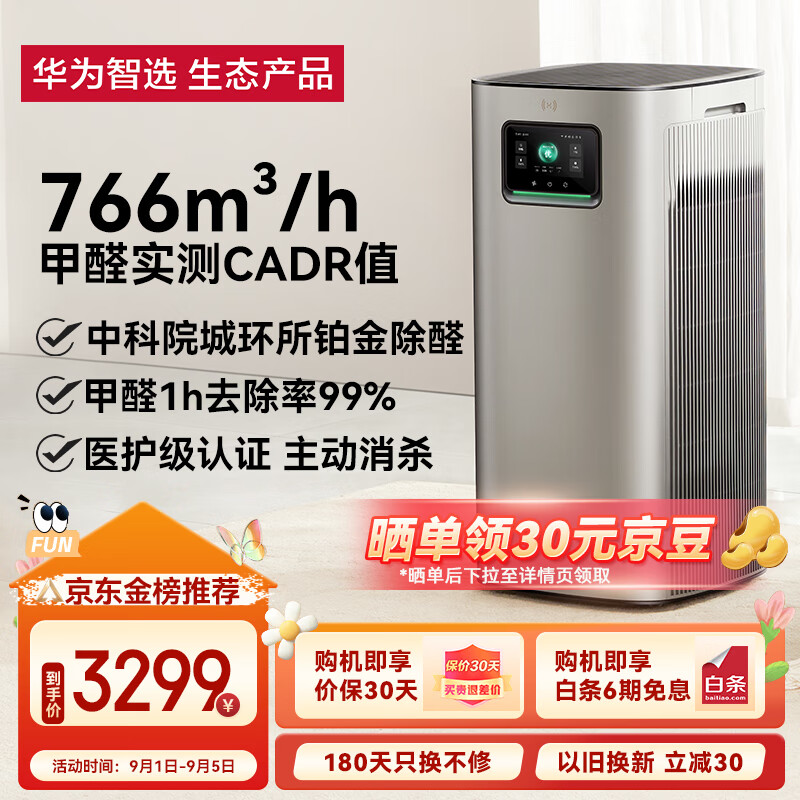 华为智选720智能空气净化器3Pro 铂金除醛 大空间疾速净化 除甲醛异味过敏原吸猫毛 主动消杀 鸿蒙智联价格:3999.00元!