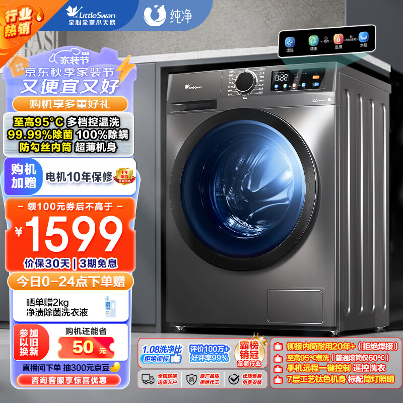 小天鹅(LittleSwan)滚筒洗衣机全自动家用【TG100APURE】深层除菌螨 10公斤大容量 排名前十名 以旧换新 超薄 内衣洗价格:1699.00元!