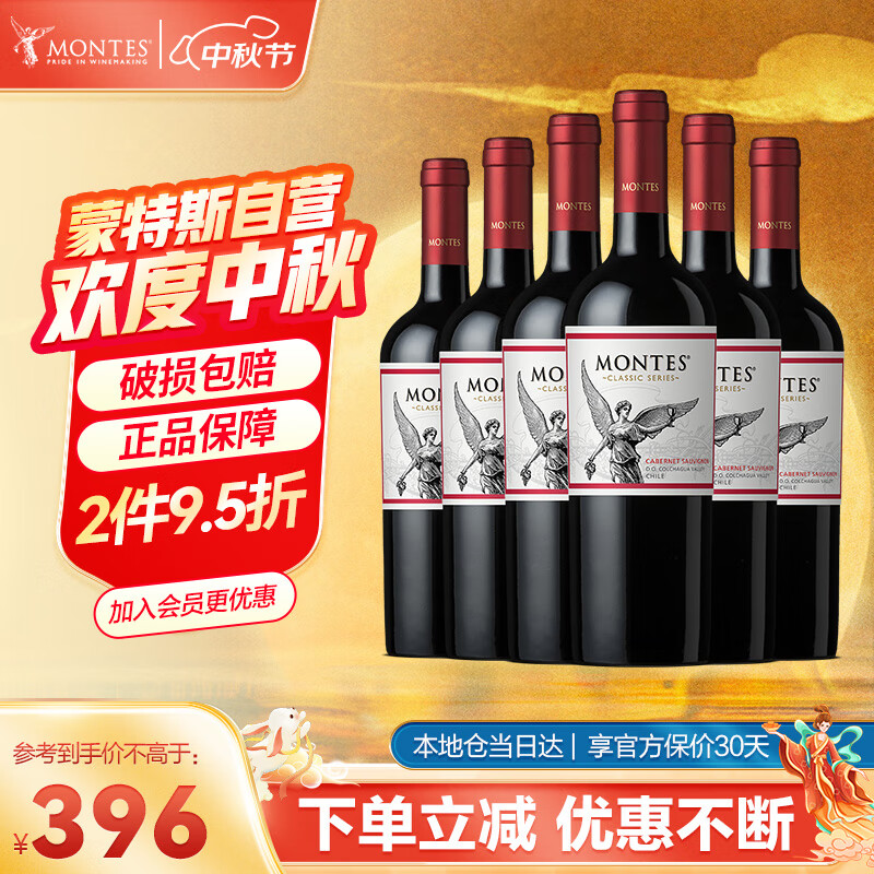 MONTES蒙特斯经典赤霞珠红酒葡萄酒750ml*6整箱日常口粮酒智利原瓶进口价格:396.00元!