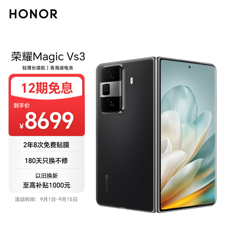 荣耀Magic Vs3 新款折叠屏 轻薄长续航 青海湖电池 荣耀绿洲护眼屏 16+1T 绒黑色 拍照 5G AI智能手机价格:8699.00元!