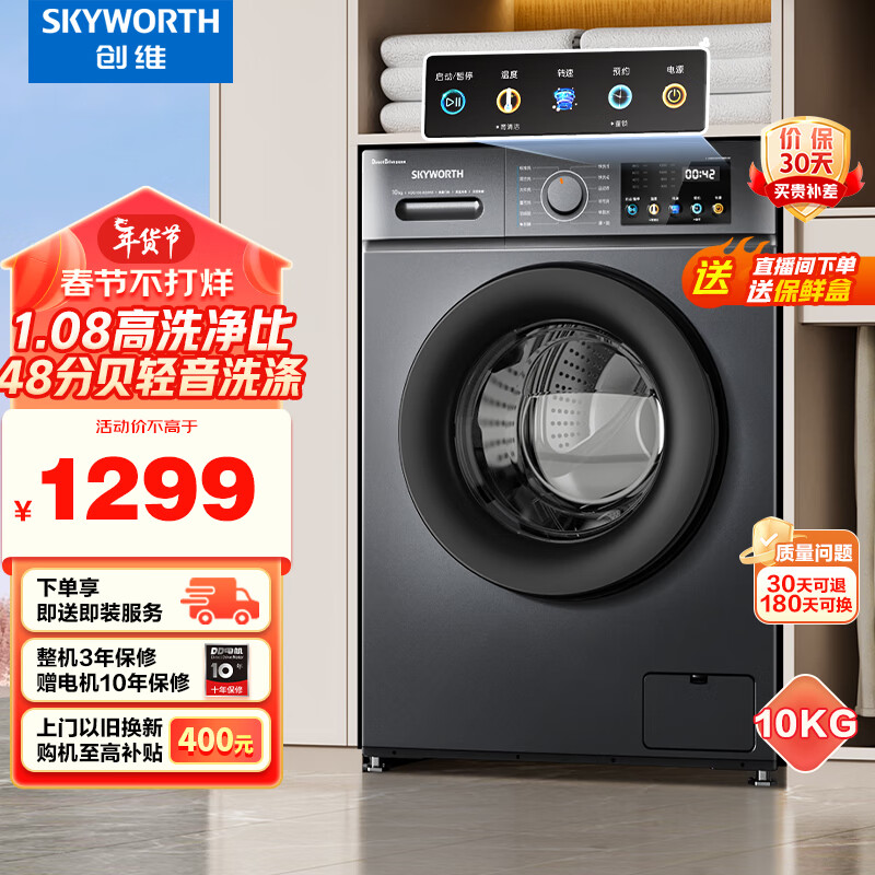 创维(SKYWORTH) 10公斤滚筒洗衣机全自动 变频低噪 大容量家用 超薄可嵌入 可速洗XQG100-B33RD价格:1299.00元!