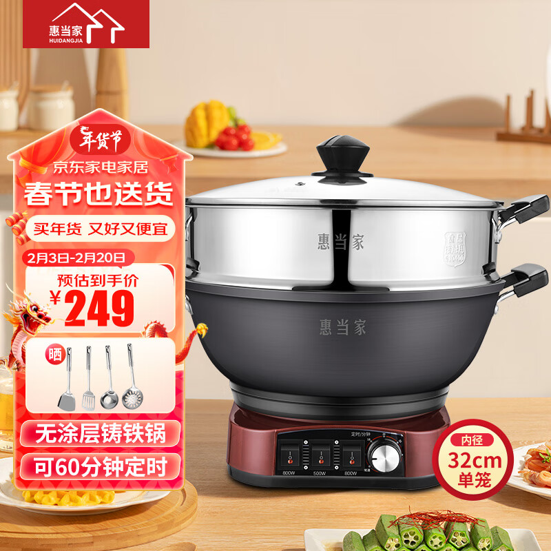 惠当家(Hui Dang Jia)电炒锅多功能电热锅电锅定时电蒸锅一体加厚铸铁锅电煮锅多用途锅 铸铁锅身-32cm单笼【定时款】价格:258.00元!