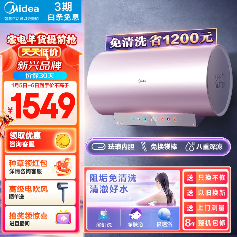 美的(Midea)免清洗电热水器60升家用 3300W变频 出水断电 镁棒免更换 阻垢 一级能效 储水式F6033-JE8(HE)价格:1649.00元!