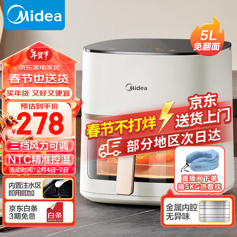 美的(Midea)空气炸锅 免翻面 可视 家用大容量 5L 炸烤箱一体 多功能 不沾易洗 蒸汽嫩炸 MF-KZC5089价格:278.00元!