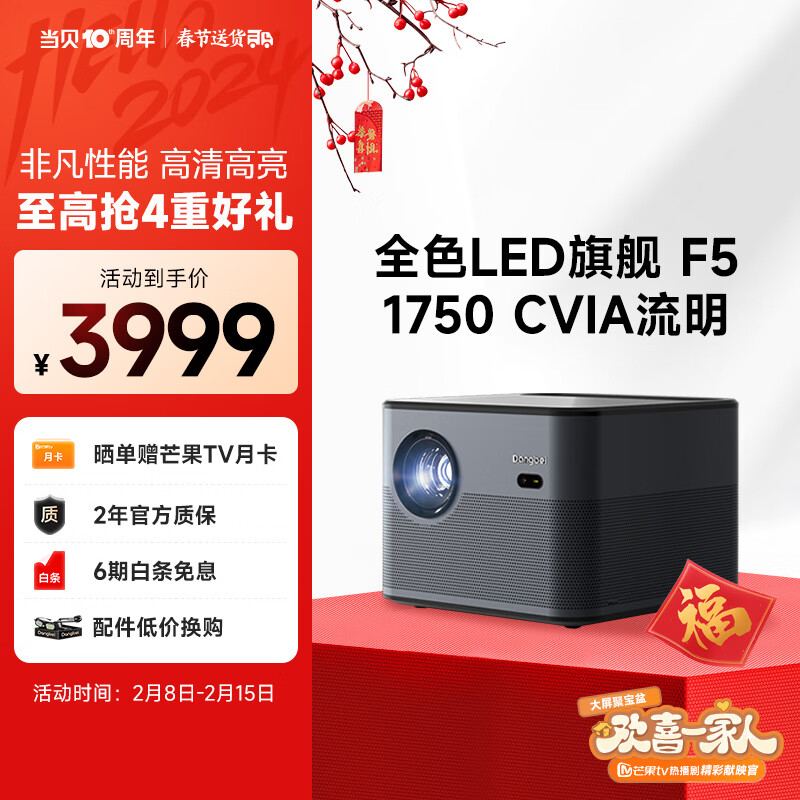 当贝 F5 投影仪 家用卧室投影机 家庭影院(全色LED旗舰 MT9669 1750 CVIA流明 双自动对焦 )价格:4299.00元!