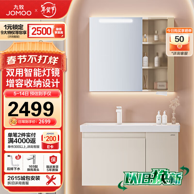 九牧(JOMOO)浴室柜陶瓷一体盆智能悬挂抗菌洗脸盆柜组合 80cm A2729-14BI-2价格:2899.00元!